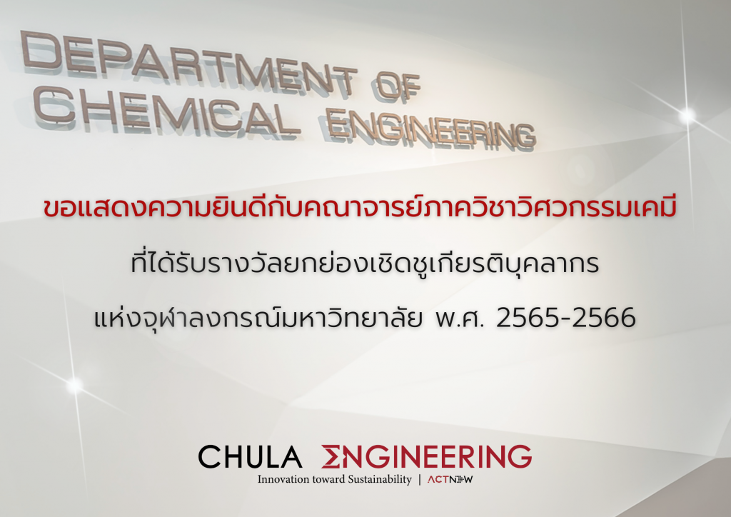 ขอแสดงความยินดีกับคณาจารย์ภาควิชาวิศวกรรมเคมี ที่ได้รับรางวัลยกย่องเชิดชูเกียรติบุคลากรแห่งจุฬาลงกรณ์มหาวิทยาลัย พ.ศ. 2565-2566