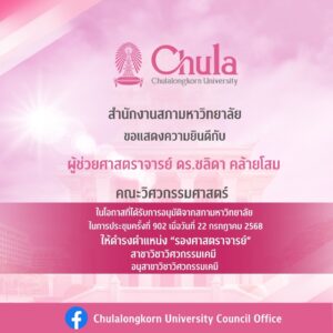 งความยินดีกับ ผู้ช่วยศาสตราจารย์ ดร.ชลิดา คล้ายโสม ภาควิชาวิศวกรรมเคมี คณะวิศวกรรมศาสตร์ Department of Chemical Engineering, Chulalongkorn University ในโอกาสที่ได้รับการอนุมัติจากสภามหาวิทยาลัยจุฬาลงกรณ์มหาวิทยาลัย ในการประชุมครั้งที่ 902 เมื่อวันที่ 22 กรกฎาคม 2568 ให้ดำรงตำแหน่ง “รองศาสตราจารย์” สาขาวิชาวิศวกรรมเคมี อนุสาขาวิชาวิศวกรรมเคมี