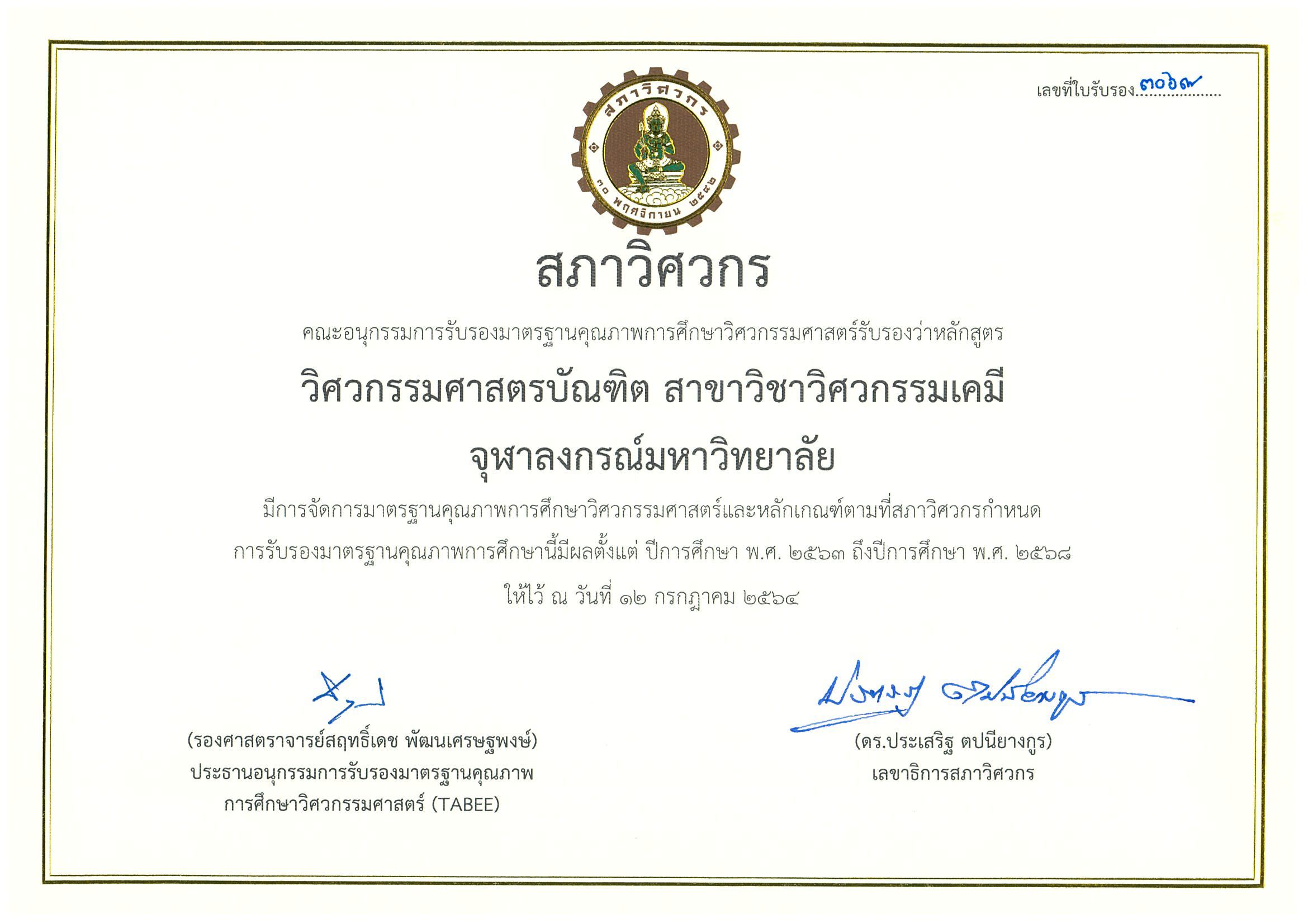หลักสูตรวิศวกรรมศาสตรบัณฑิต สาขาวิชาวิศวกรรมเคมี จุฬาลงกรณ์มหาวิทยาลัย ได้ยื่นขอรับการรับรองมาตรฐานคุณภาพการศึกษาวิศวกรรมศาสตร์ (TABEE) จากสภาวิศวกรในการประเมินหลักสูตร โดยคณะกรรมการสภาวิศกรพิจารณาแล้วเห็นควรรองรับหลักสูตรวิศวกรรมศาสตรบัณฑิต สาขาวิชาวิศวกรรมเคมีคณะวิศวกรรมศาสตร์ เป็น Full accreditation ซึ่งมีระยะเวลาการรับรองจำนวน 6 ปี ตั้งแต่ปีการศึกษา 2563 – 2568